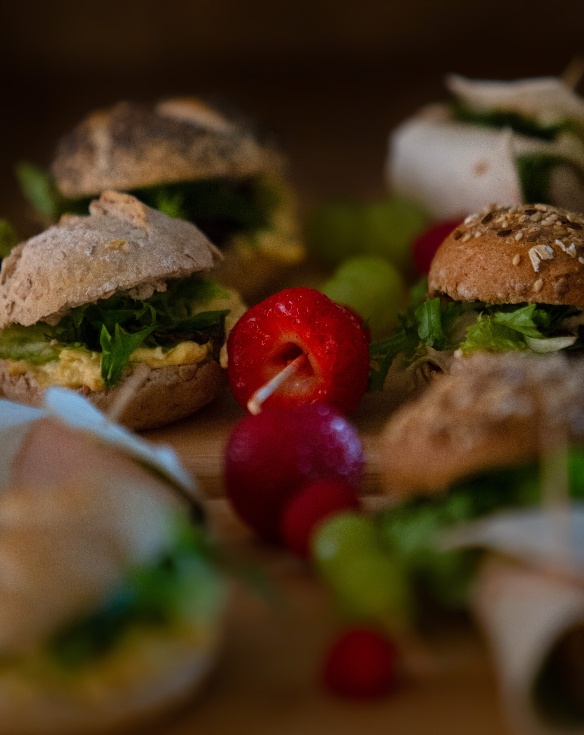 Diverse hartige hapjes zoals heerlijke broodjes en wraps. Bij deze ronde zitten zowel vegetarische als non-vegetarische hapjes.